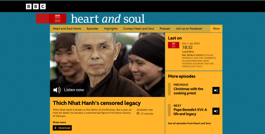 2022 – BBC World Service “Heart & Soul: Thích Nhất Hạnh’s Censored Legacy.”